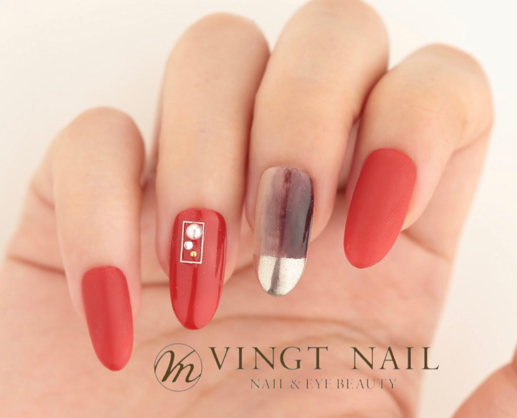 赤のワンカラーにアクセントにミラーネイル。