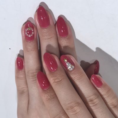ツリーとリースをいれたクリスマスネイルです♪ 色もこだわってちゅるんとした赤ピンク♪ 女性らしくてとっても可愛いです(^-^)